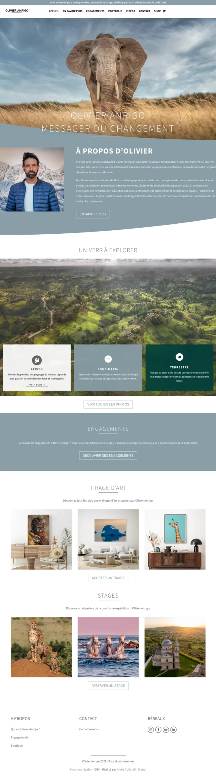 Refonte site web avec ajout d’une boutique e-commerce pour permettre l’achat de tirages. La refonte des pages actuelles était tournée vers la mise en avant du portfolio avec les images photographiées par Olivier.